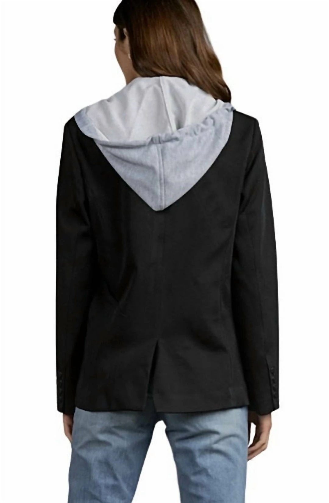 A combination of cozy and class is our Alice blazer hoodie. This one-look jacket provides all-day comfort with a sleek, polished silhouette. Style with denim for an easy go-to look. Black fitted blazer with a removable zip in grey sweatshirt hoodie.