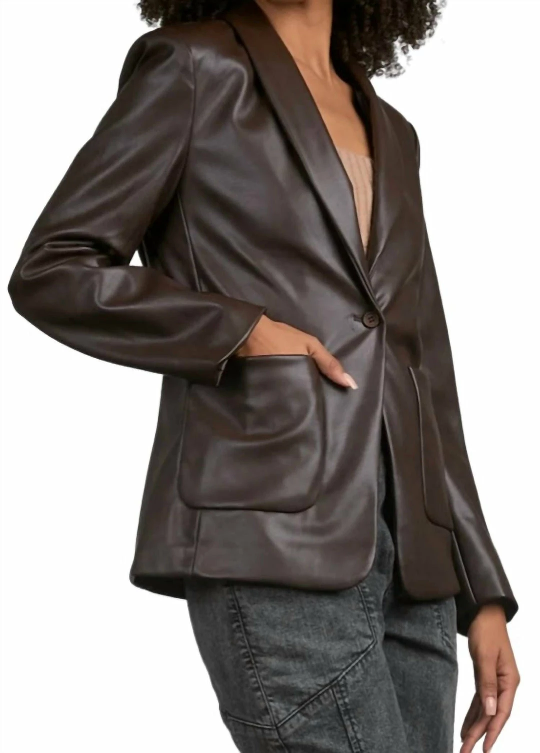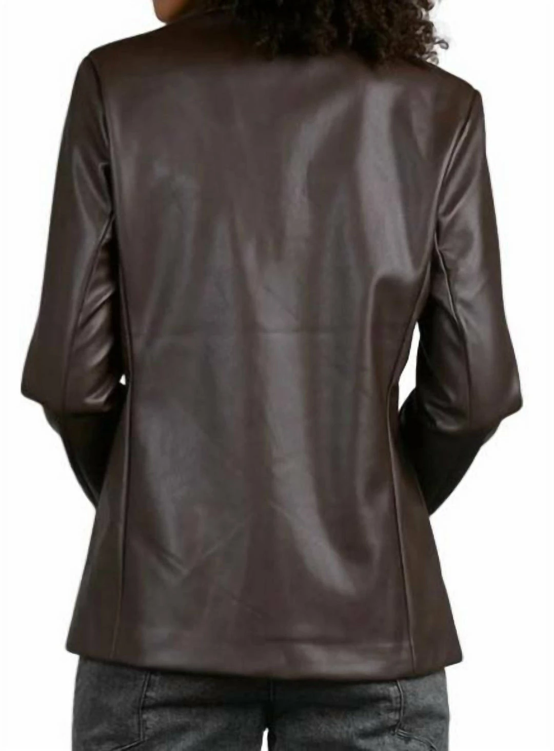 Kiki faux leather blazer is a timeless piece for your wardrobe this Fall. Dress up for cocktails or dress down for the office for a sleek yet feminine look. This versatile staple styles great with most fabrics if being layered.
