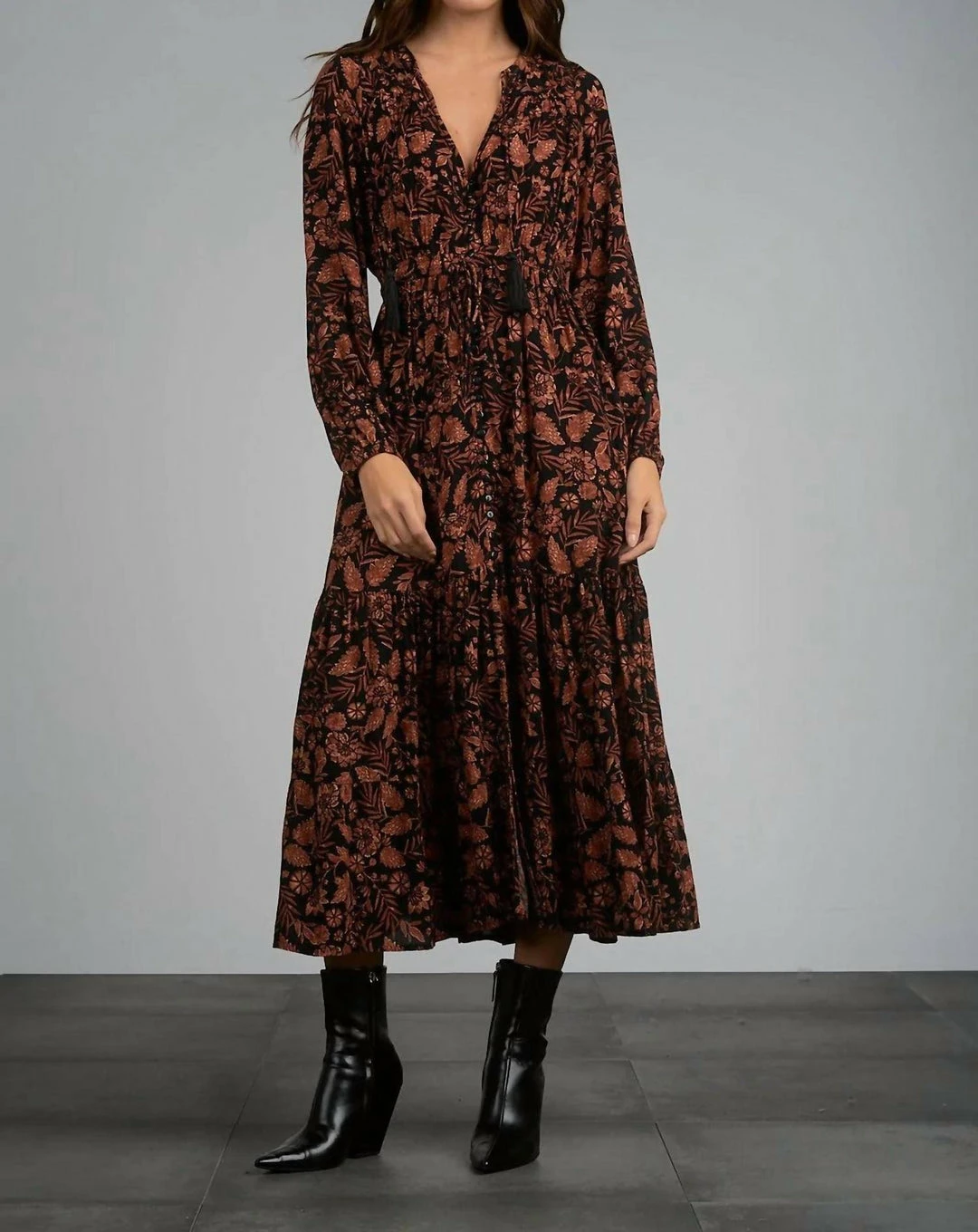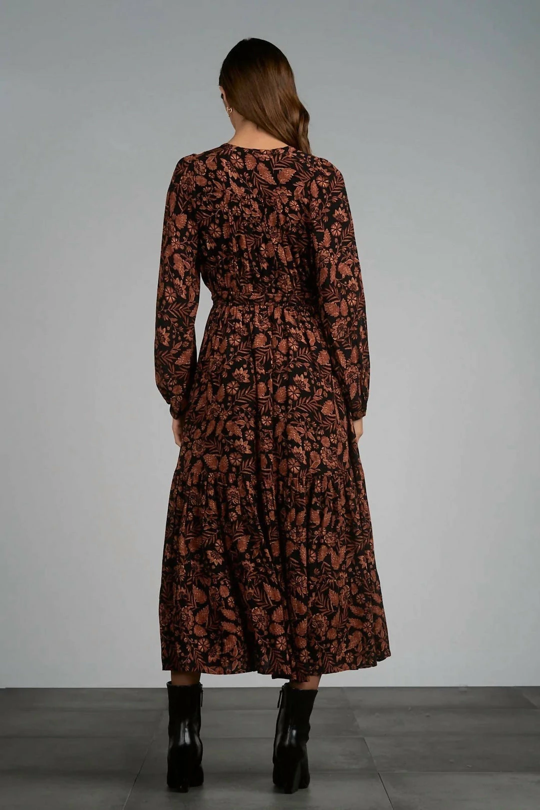 DETAILS –  A true fall vibe, the January Maxi dress is long sleeve in a vintage-inspired print. Featuring a V-neck and charming peasant sleeves, style belted or unbelted for a chic look. Tie-waist. Runs true to size