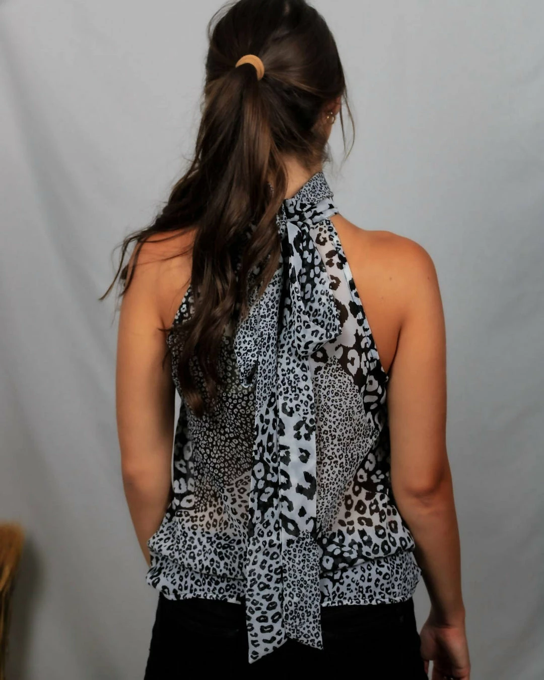 The Jojo leopard top is one of those sexy yet sweet kind of tops, that can be dressed up or down. It features a high neck line, and zipper closure in the back. It also has two long strands that can be tied in the back of the neck, or in the front.Hand Wash, No Bleach, Do Not Tumble Dry, Iron Low TempFit Guide –  Model is wearing size Small Model is 5 ft 5 in. 118 lb. Bust 34″ Waist 27″ Hips 35″