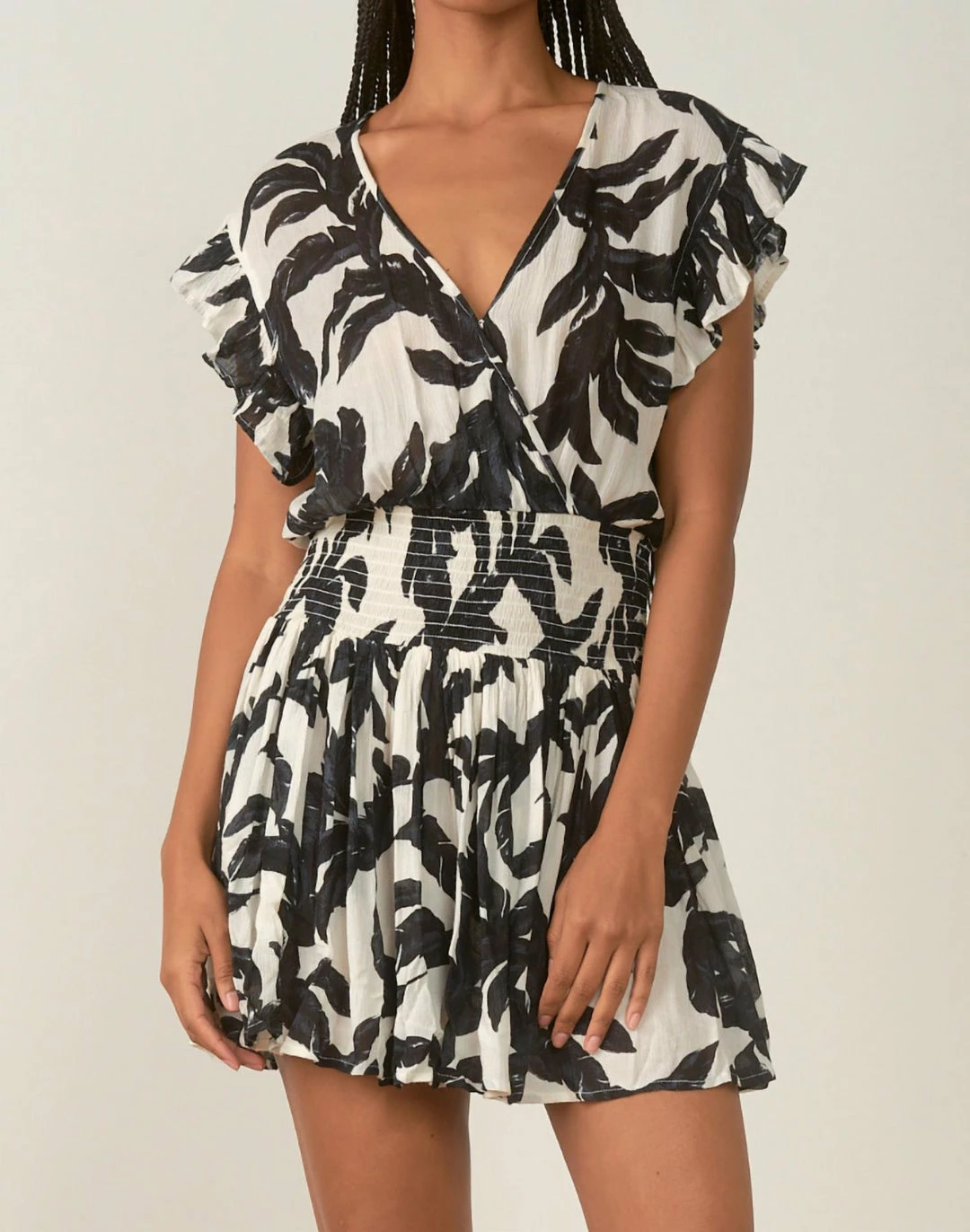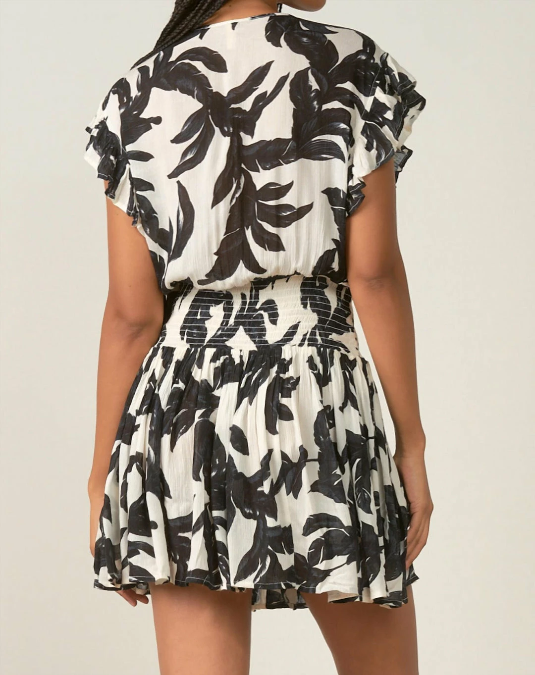 The Leaf Print Dress Is A Black And White Dress With Ruffled Flutter Sleeves And A Smocked Waist.��The Open Neckline Is A Surplice Style With A Snap To Keep It Closed.��There Is A Hint Of Blue In The Black Leaf Pattern.��100% Rayon.