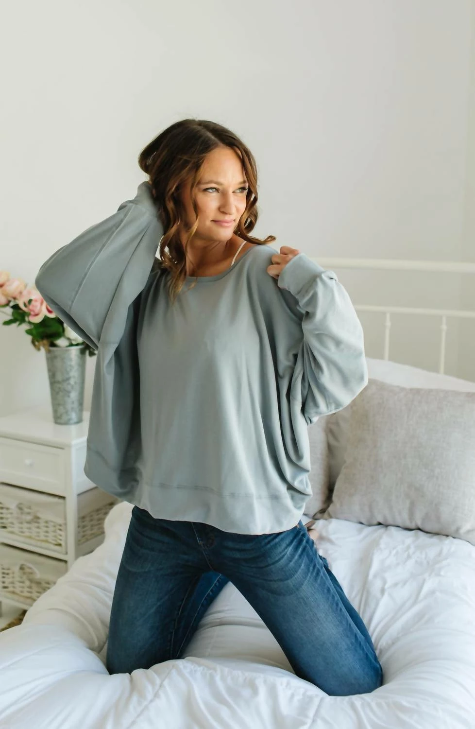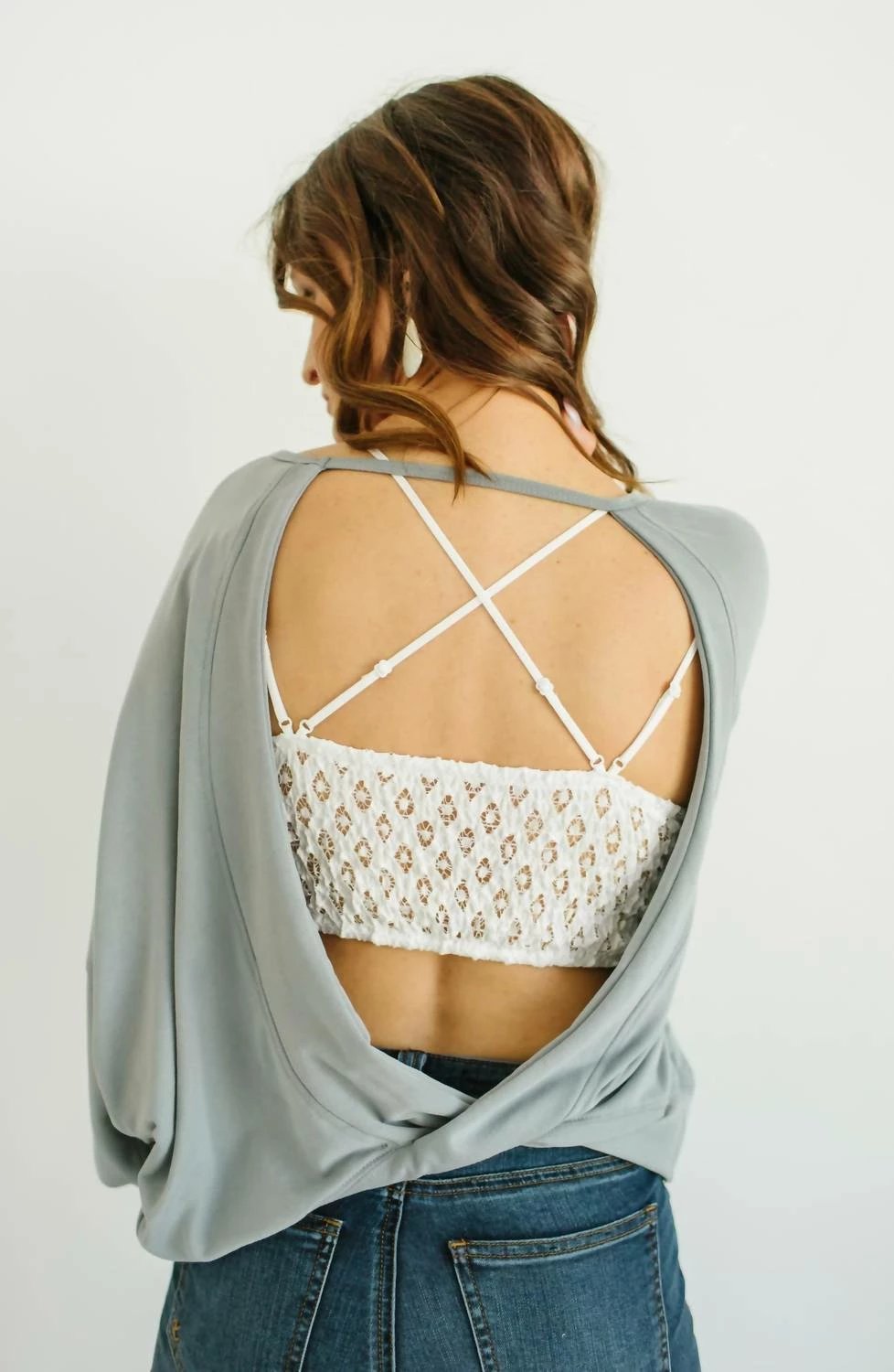 Details – Asymmetrical hemUnique woven open-back designJewel neck Elastic cuffsModel Details – Height – 5’2″Bust – 36″Waist – 26″Hips – 34″Wearing size SCare Instructions – Hand wash cold, gentle cycle inside outNon-chlorine bleachLaw flat or hang to dry