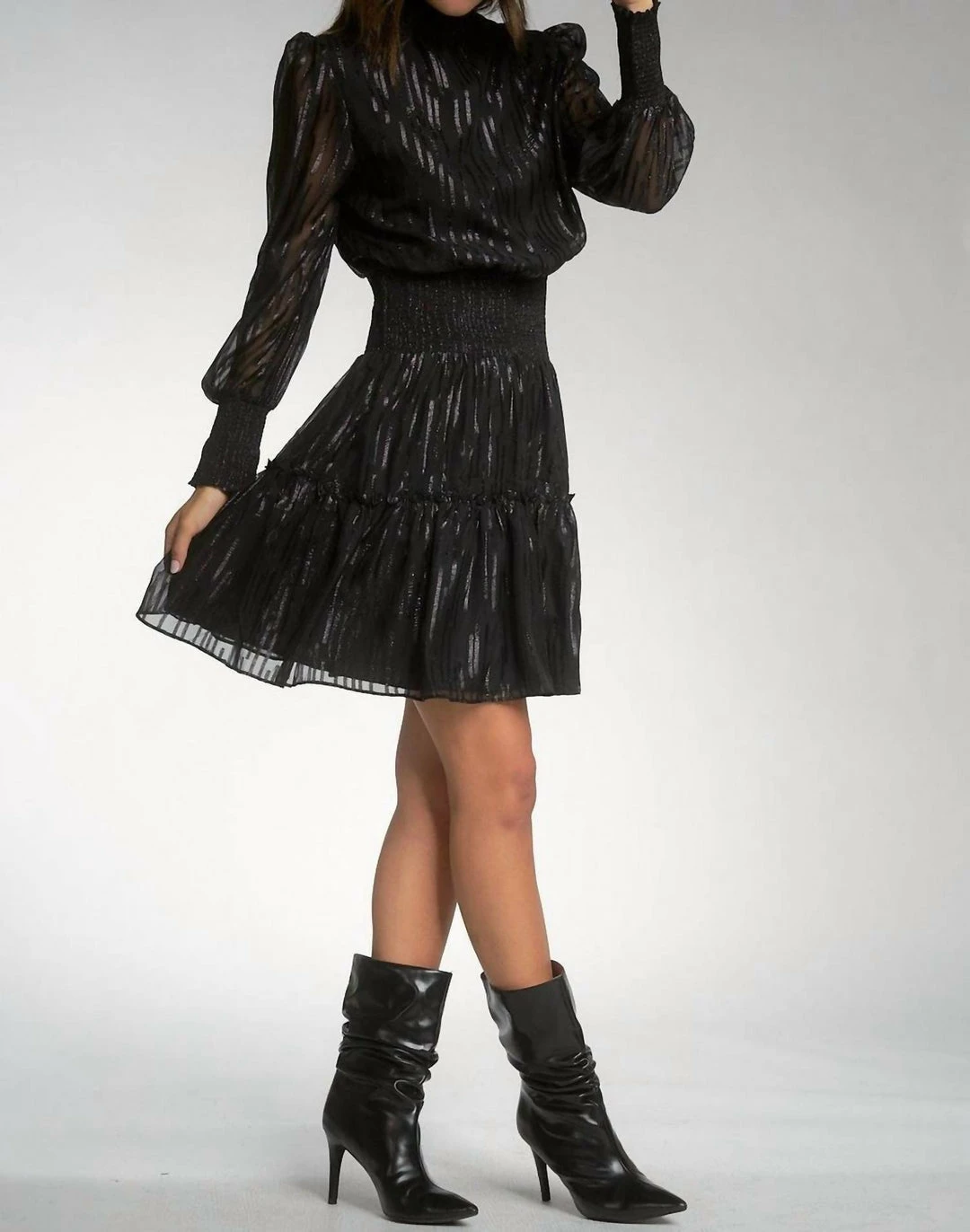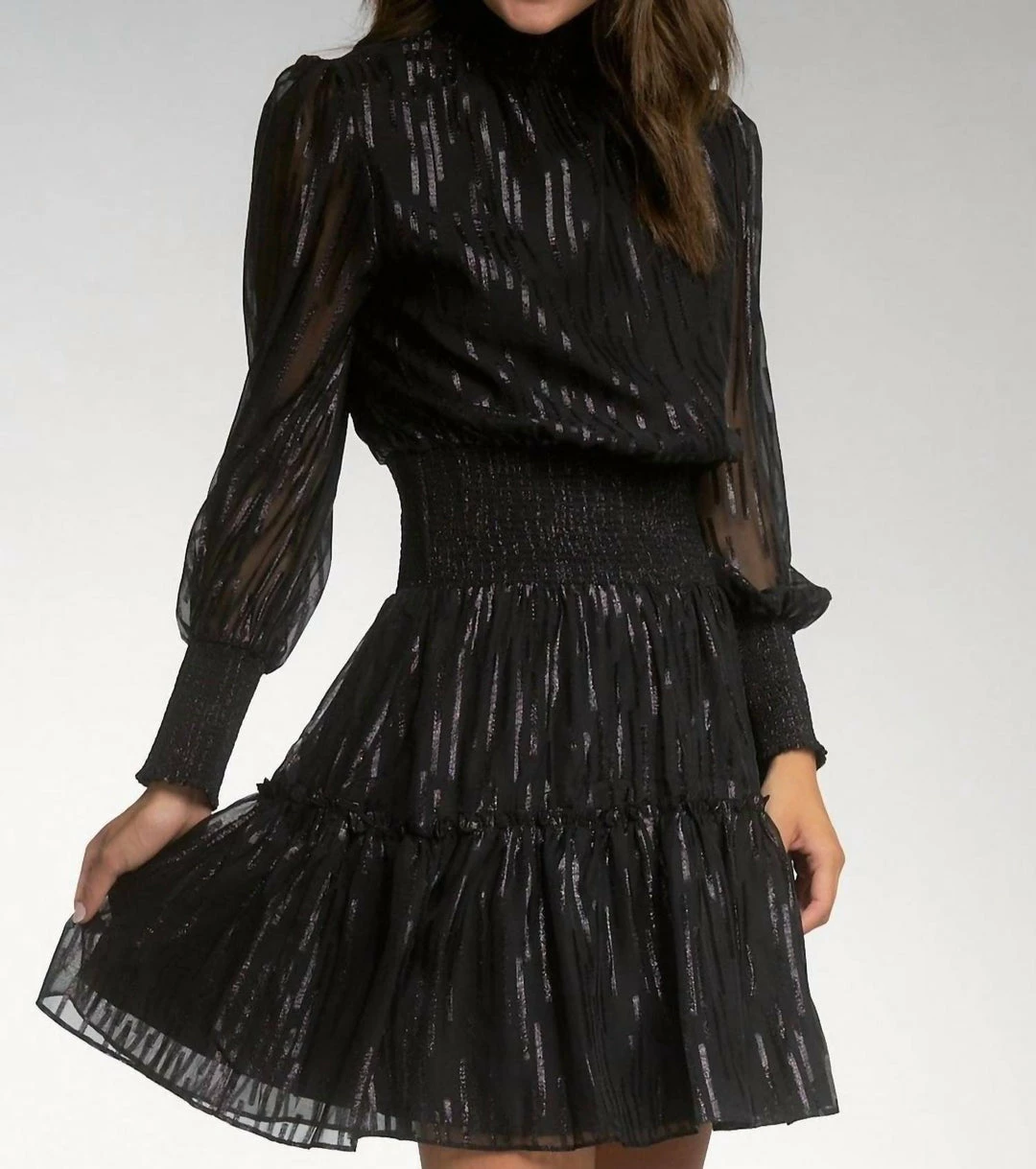 Troya dress is sophisticated and chic for your next Holiday appearance. Designed with silver threading accents, this dress has a flattering smocked waistband, high neckline, and a sheer sleeves for a sexy look. Silhouette is classy.FitFits true to size.