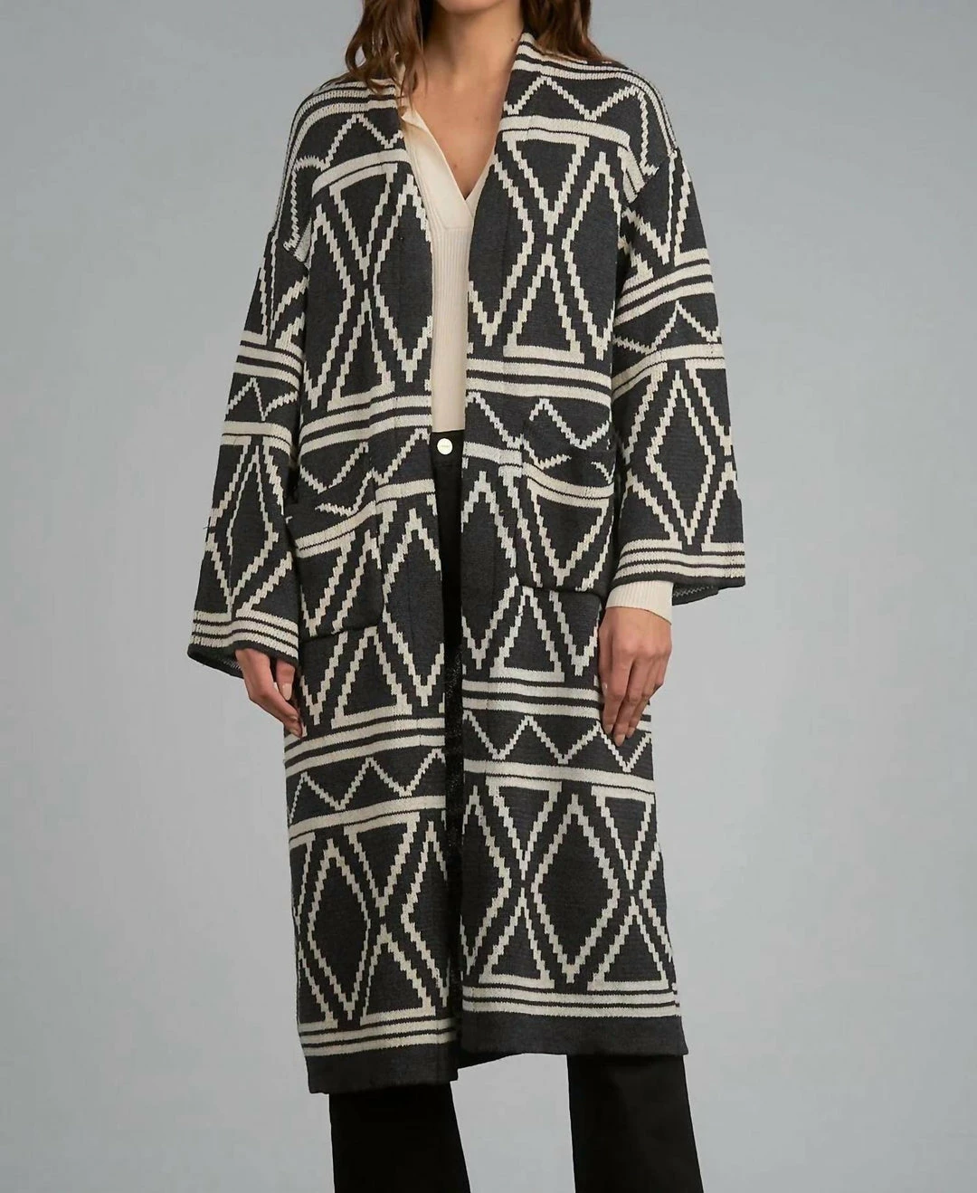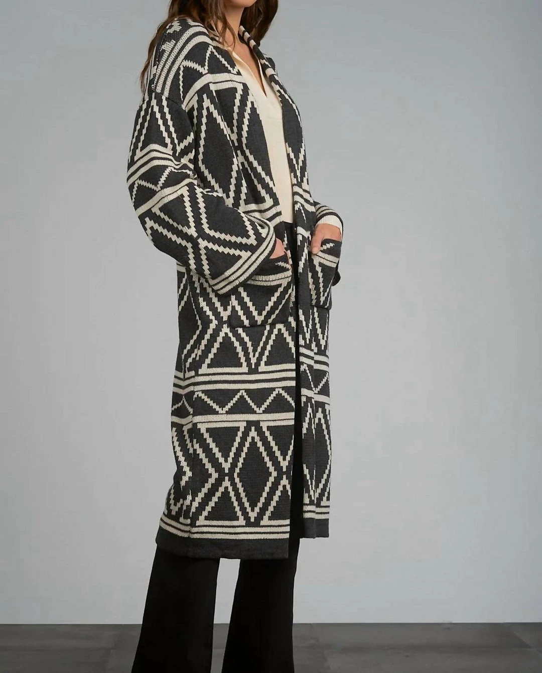 DETAILS – Â The Vail long-length cardigan is a classic silhouette featuring an ultra-soft knit, gorgeous aztec print, and front pockets. Featuring a relaxed, natural fit for easy layering.SIZE AND FIT – Â Runs a little big, Model Measurements – Height – 5’9 Bust – 34″ Waist – 25″ Hips – 36.5″ Model is wearing a size smallCARE – Dry CleanÂ