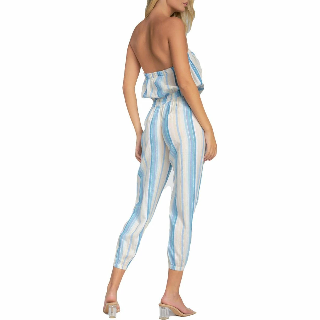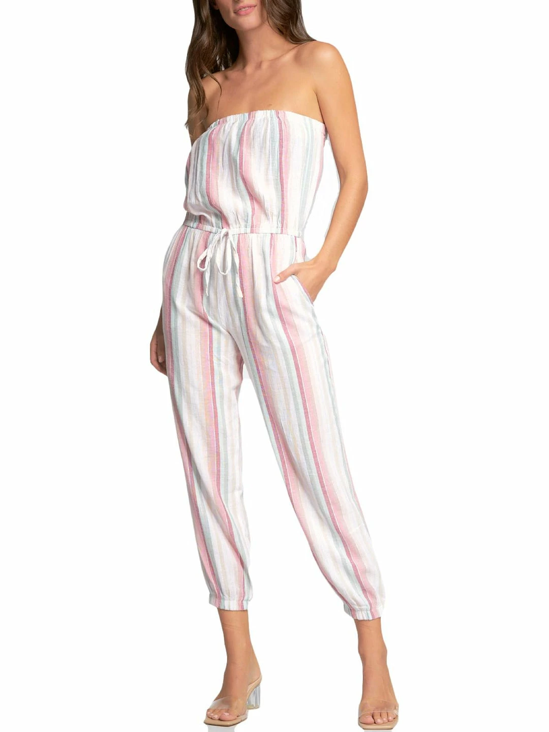 Feel effortlessly chic in this strapless striped cropped leg jumpsuit by Elan. Made with Cotton, Rayon, Flex and Metallic Fibers. This contrasting stripes are paired with a cropped leg and a strapless construction. This summery look is finished off with a tasseled tie waist and two front pockets. Pair it with your favorite sandals for a laid back beachy vibe. Blouson style waist. Pull On. This jumpsuit is guaranteed authentic.