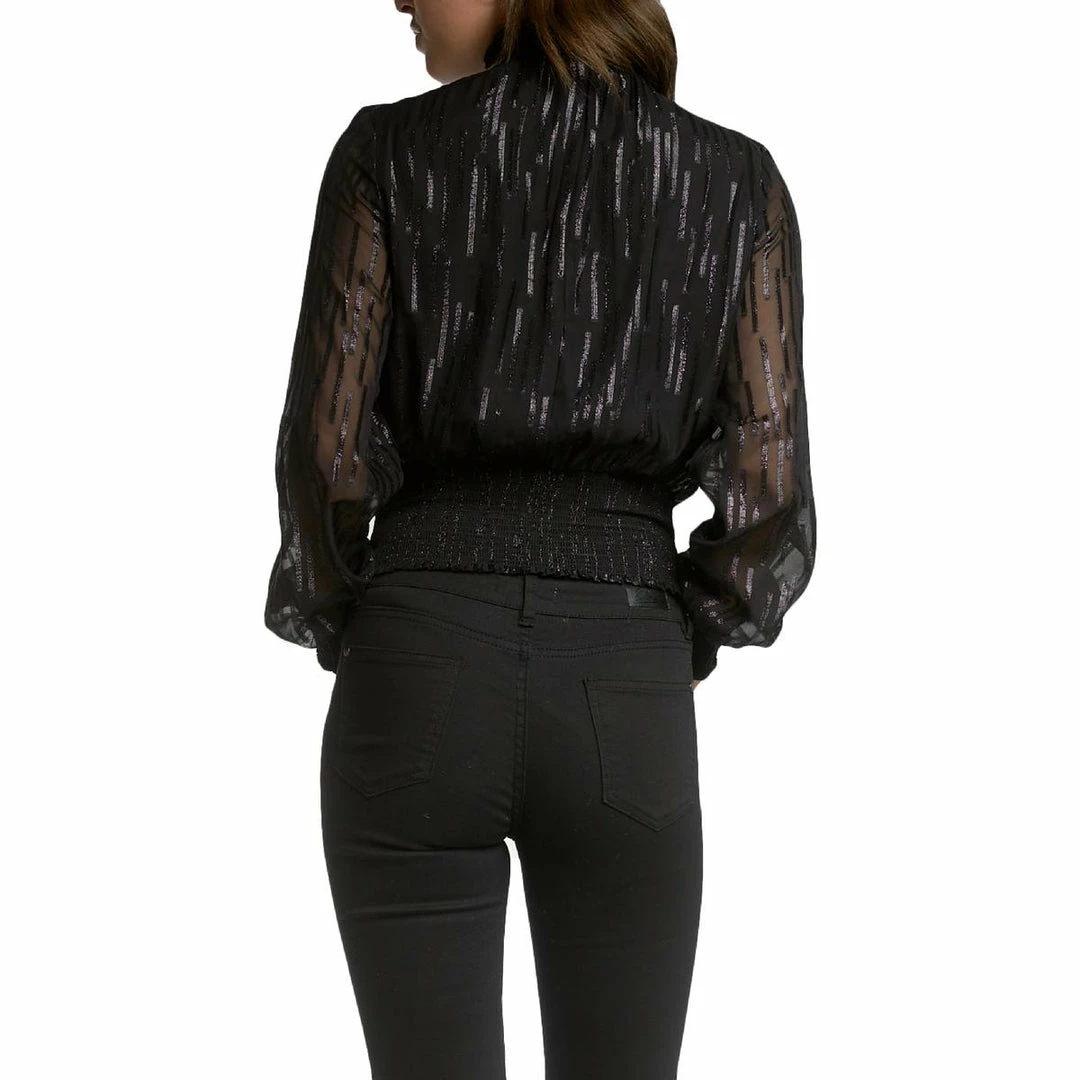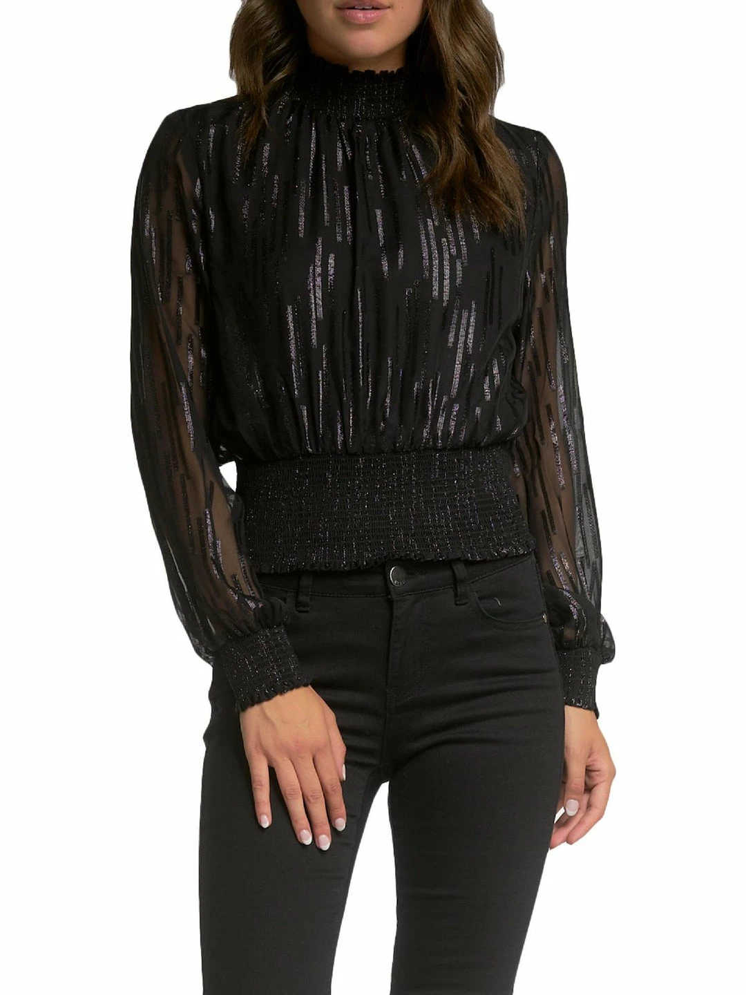 This printed smocked blouse by Elan offers an elevated sense of style. Made with 100% Polyester. This top’s shimmery print, sheer details, and smocked trimming. It’s upscaled look will make it a favorite with your favorite denim for a night out. Pull On. This top is guaranteed authentic.